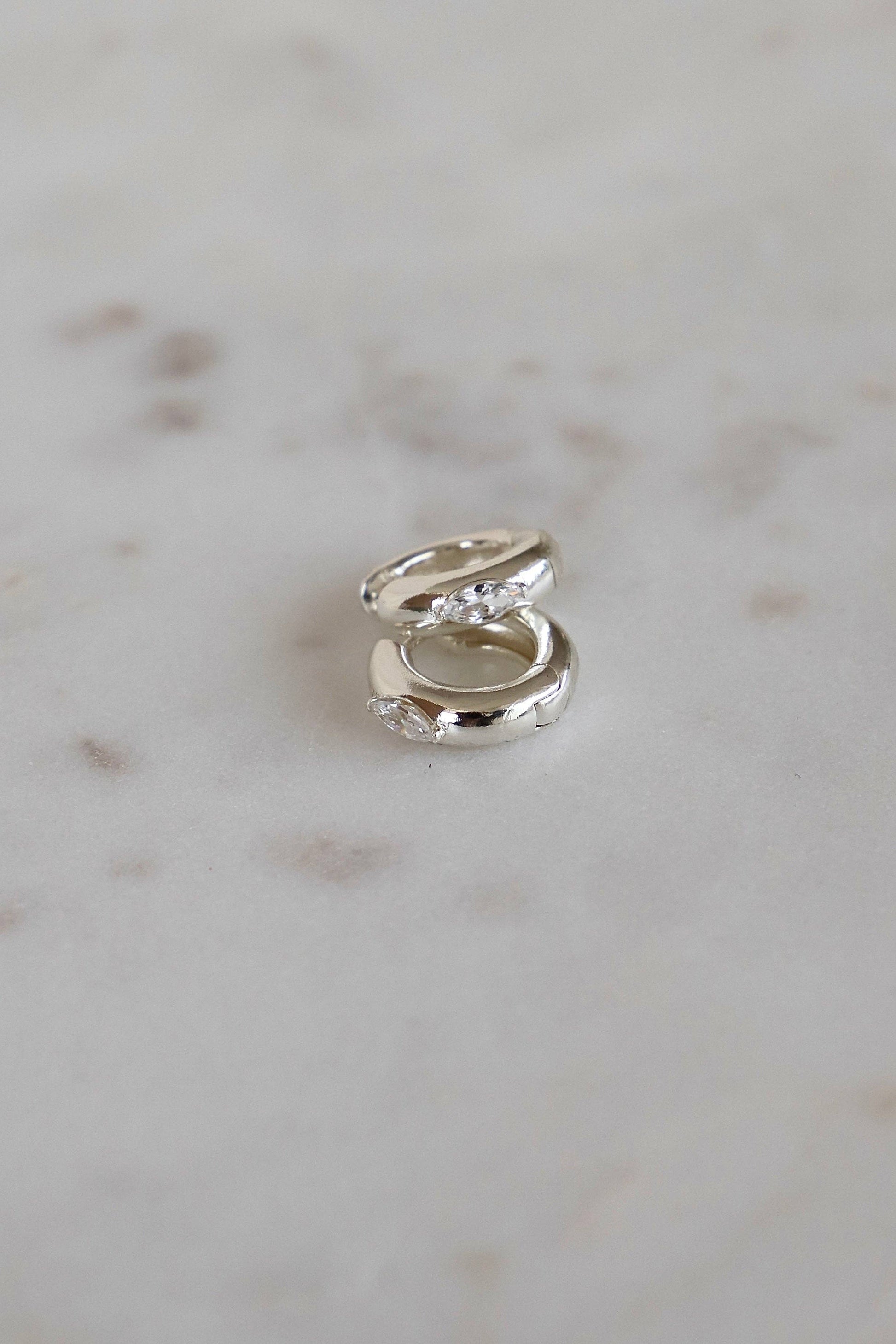 Meet the hoops every it-girl has on repeat. The Aurum Hoops are bold, thick huggies with just the right amount of edge—elevated by a sleek marquise-cut CZ that catches the light (and compliments). Whether you're styling a slick bun or tousled waves, these stunners add instant polish. A statement without the fuss—aka, your new go-to. Available in silver and gold!
