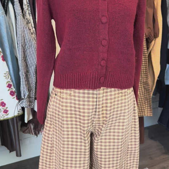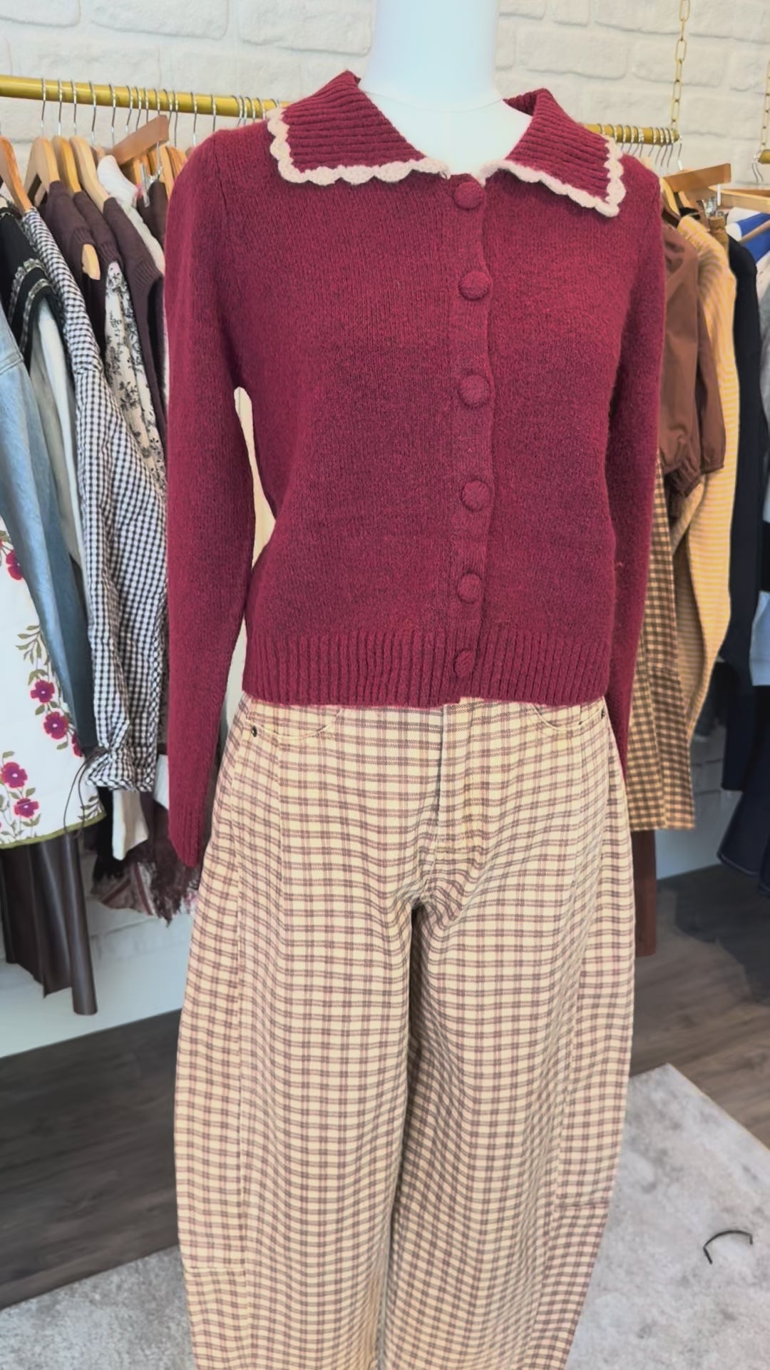 Meet the Scarlett Collar Cardigan — a cozy-meets-charming knit that’s brimming with vintage appeal. Crafted in a rich cranberry red, this soft textured sweater features a statement ribbed collar trimmed with delicate cream crochet scalloping for the sweetest touch. Covered buttons down the front complete its timeless, feminine feel. Perfect for layering over blouses or pairing with plaid trousers for a polished holiday look that feels effortlessly boutique-chic.