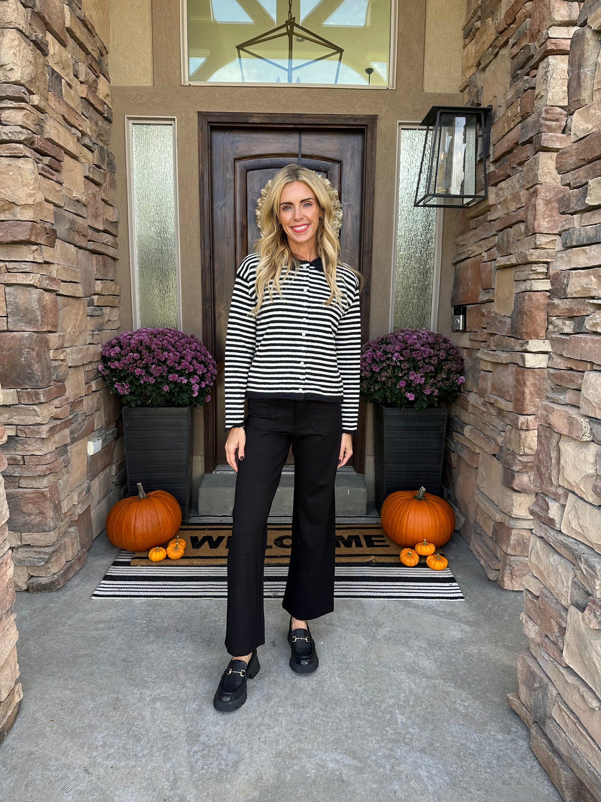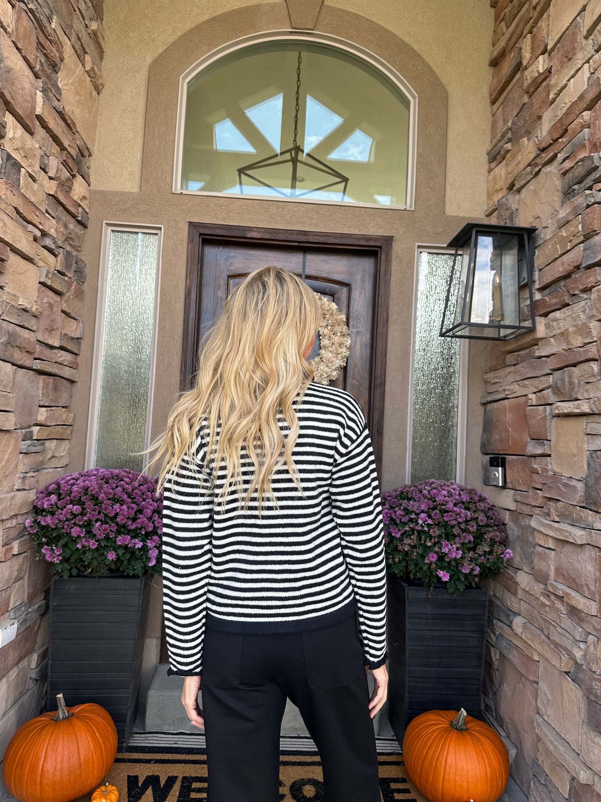 Meet your new fall favorite — the French Girl Striped Cardigan, where timeless Parisian stripes meet effortless chic. This soft knit button-up features bold black and ivory stripes in a perfectly relaxed silhouette that pairs beautifully with denim, trousers, or a sleek midi skirt. Lightweight yet cozy, it’s the kind of piece that makes even casual days feel elevated.