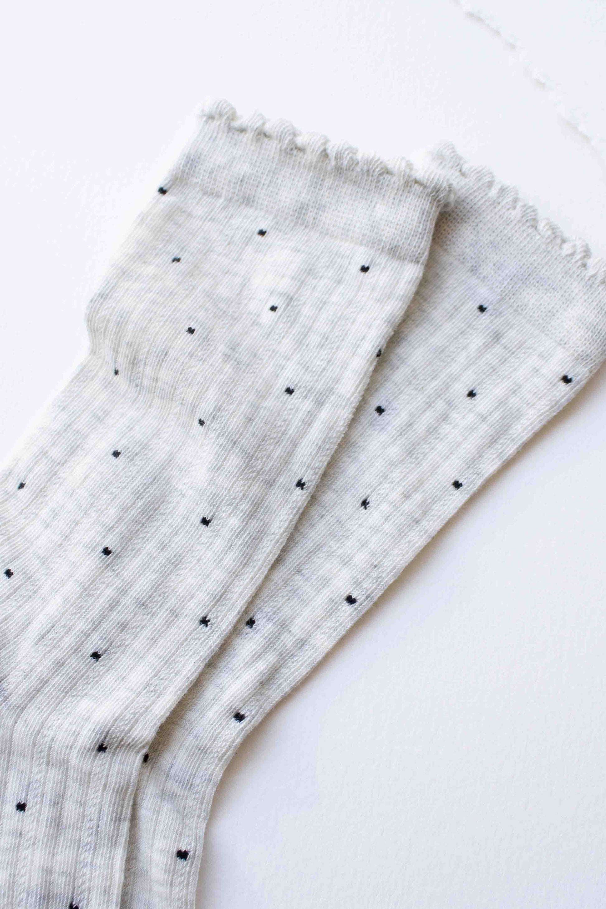Add a touch of charm to your everyday essentials with our Frill Edge Ribbed Polka Dot Crew Socks. Designed for both comfort and subtle style, these socks feature a ribbed texture with delicate mini polka dot patterns and a sweet frilled edge. Perfect for pairing with loafers, sneakers, or ankle boots.