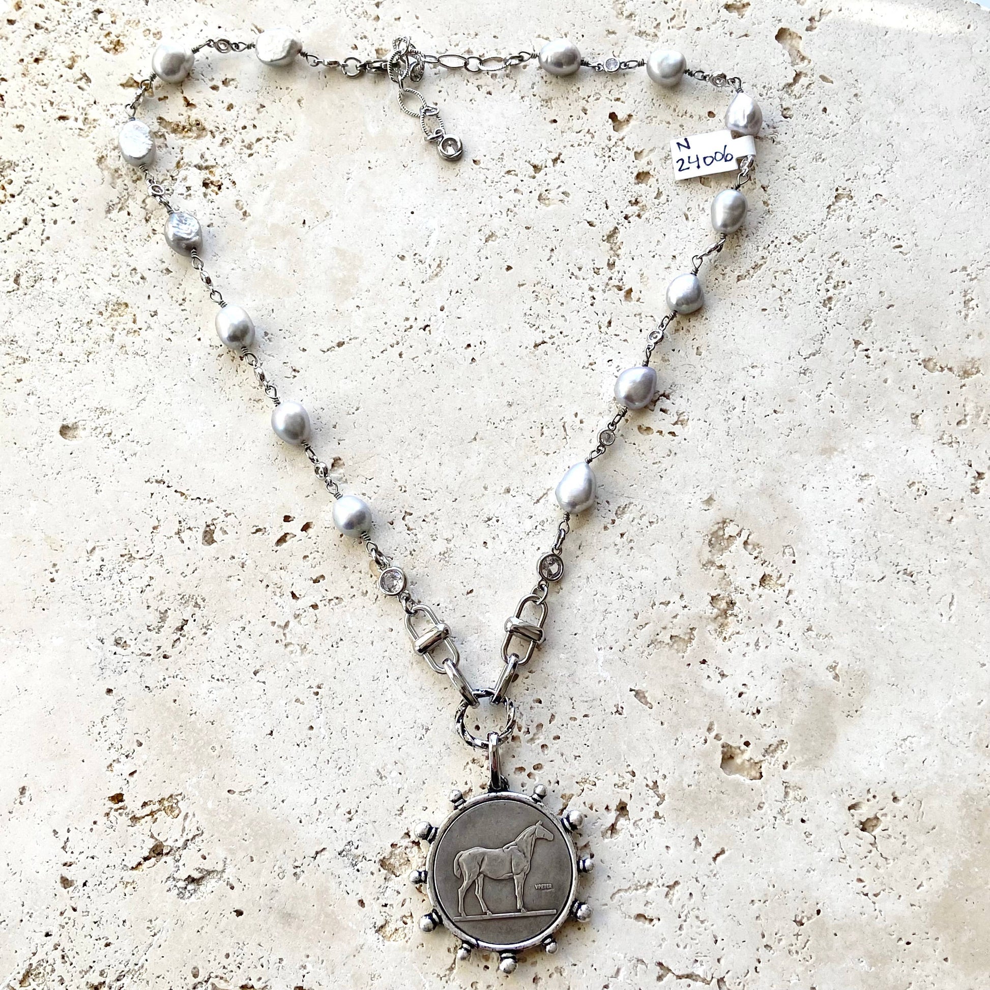 A striking blend of equestrian heritage and modern elegance, the Belmont Medallion Necklace is a true statement piece. At its center, a vintage-inspired coin pendant features a finely detailed horse motif framed with bold beaded accents—an ode to timeless strength and grace. The pendant is paired with a unique chain, adorned with luminous freshwater pearls and subtle crystal stations, creating a balance of rugged charm and refined femininity.