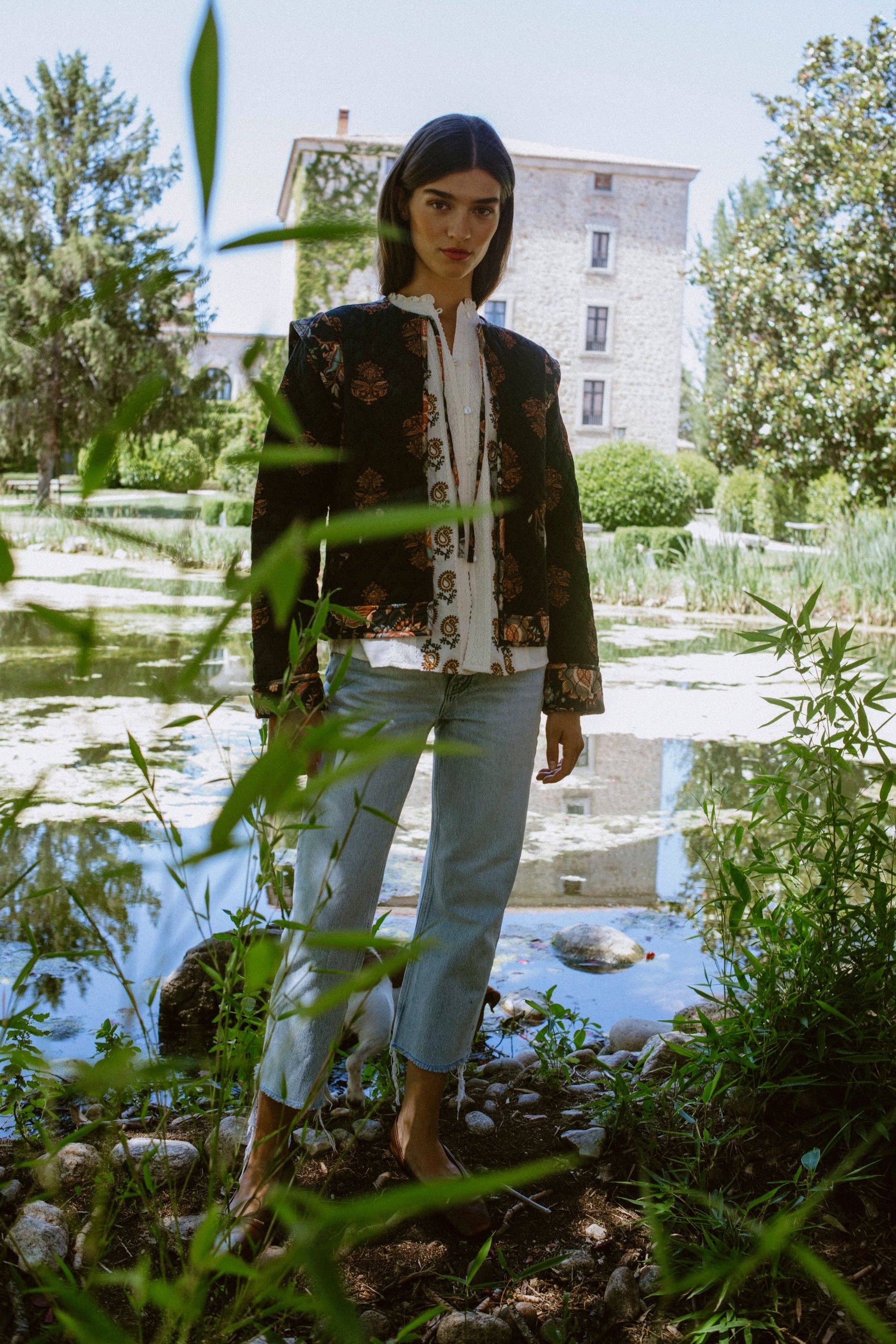 Short quilted jacket in printed organic cotton