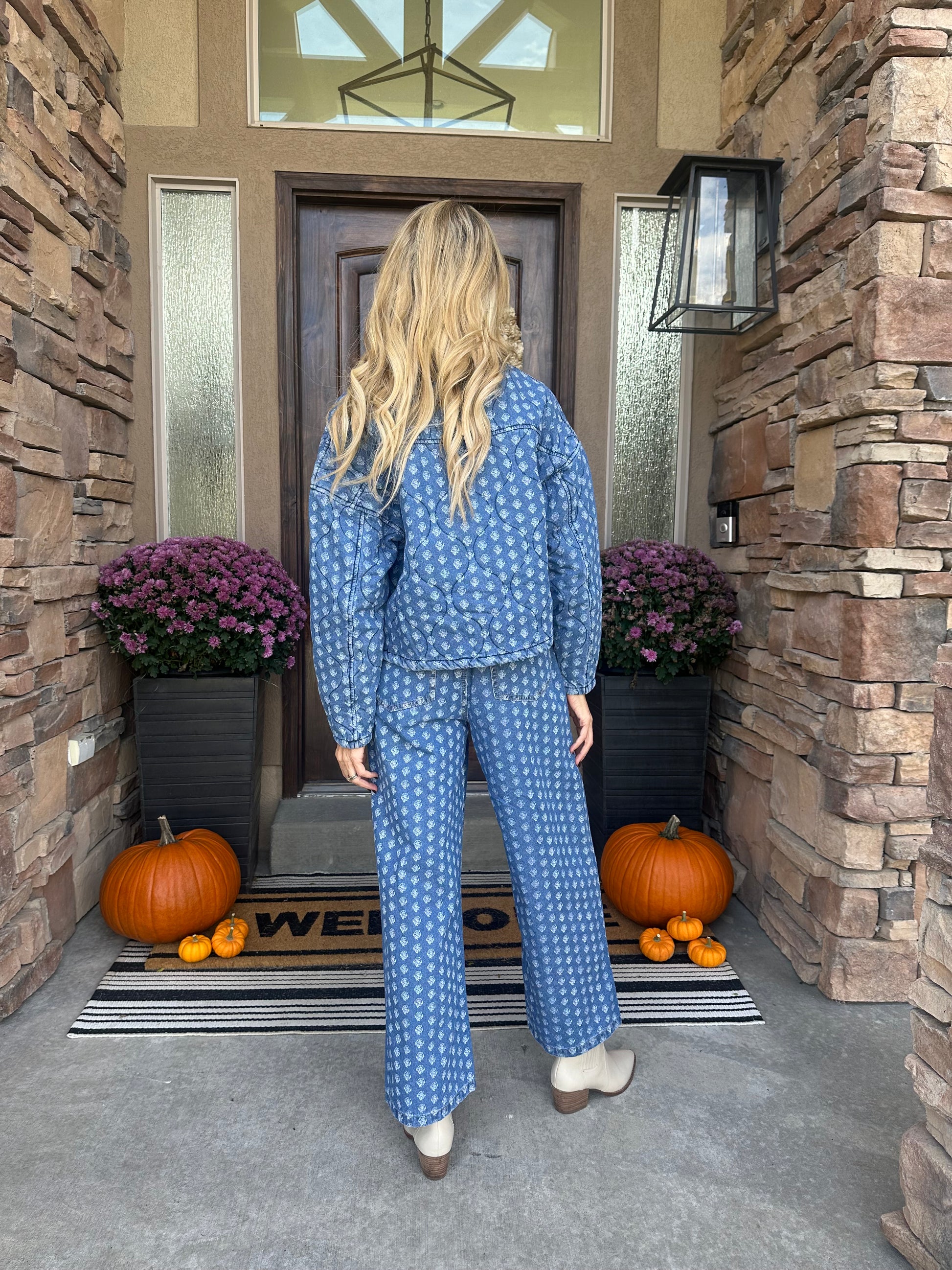 The Provence Quilted Denim Pants bring vintage charm and modern ease together in one beautifully tailored piece. Designed in soft washed denim with an intricate floral block print, these pants mirror the jacket’s signature quilted texture and artisanal stitching. The straight-leg silhouette flatters effortlessly, while the high-rise waist and patch pockets add a hint of utility to the romantic pattern.