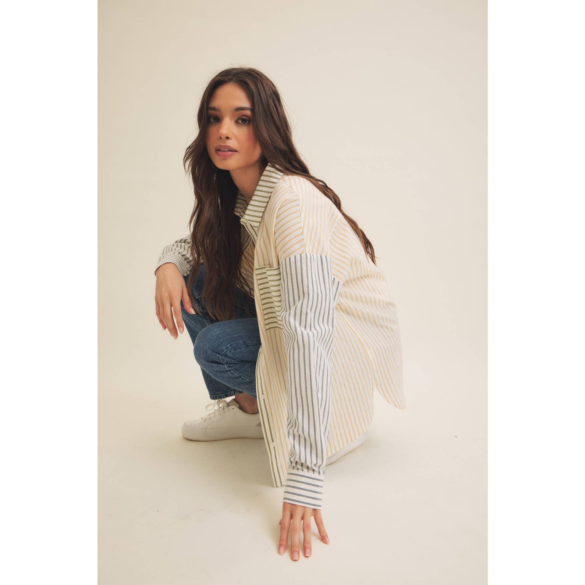 Featuring a blend of warm honey, sage, and slate stripes, this top adds instant personality to even the simplest outfit. The relaxed fit makes it ideal for layering over tanks, styling front-tucked with denim, or wearing open as a light spring button-down.