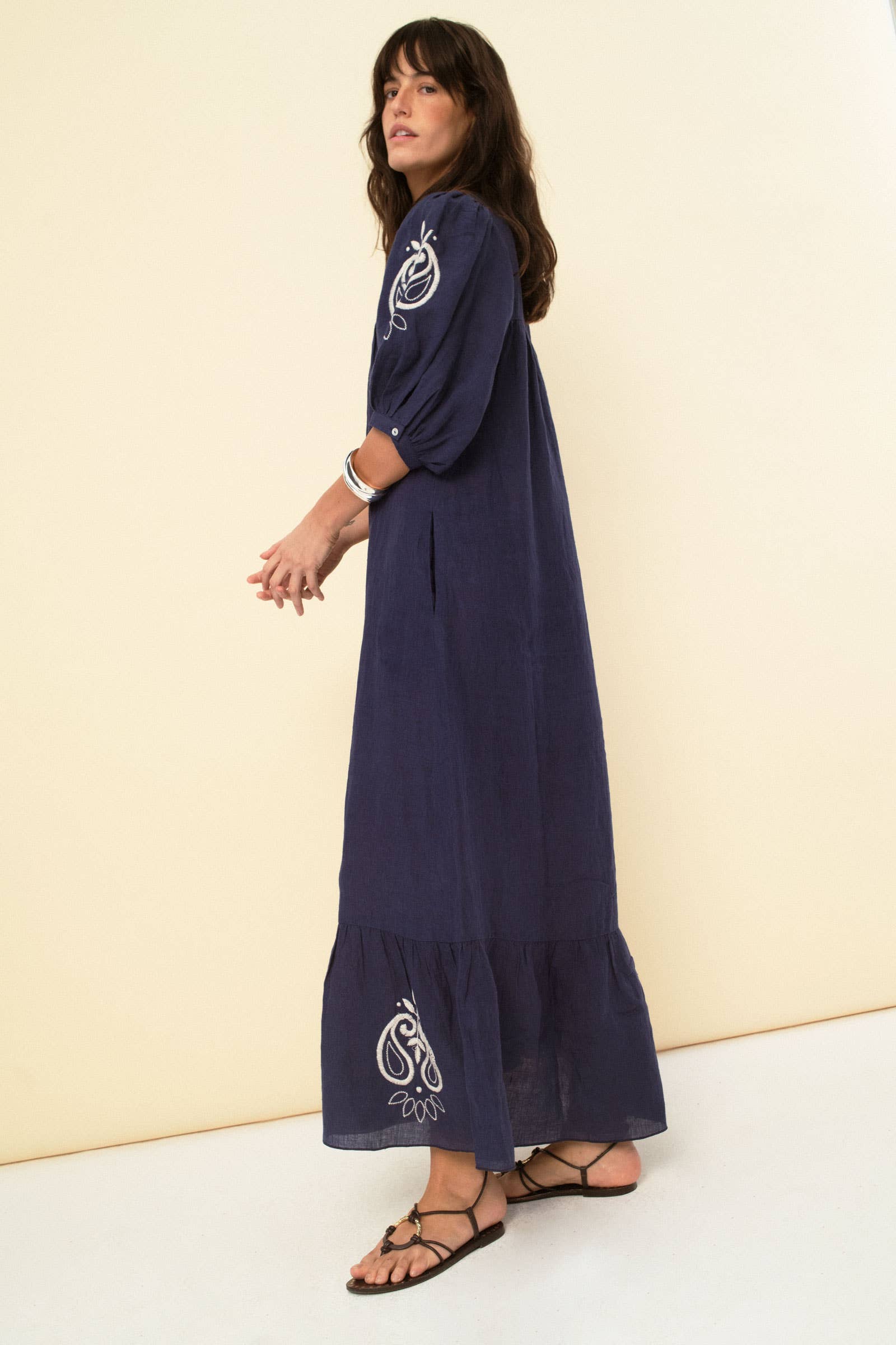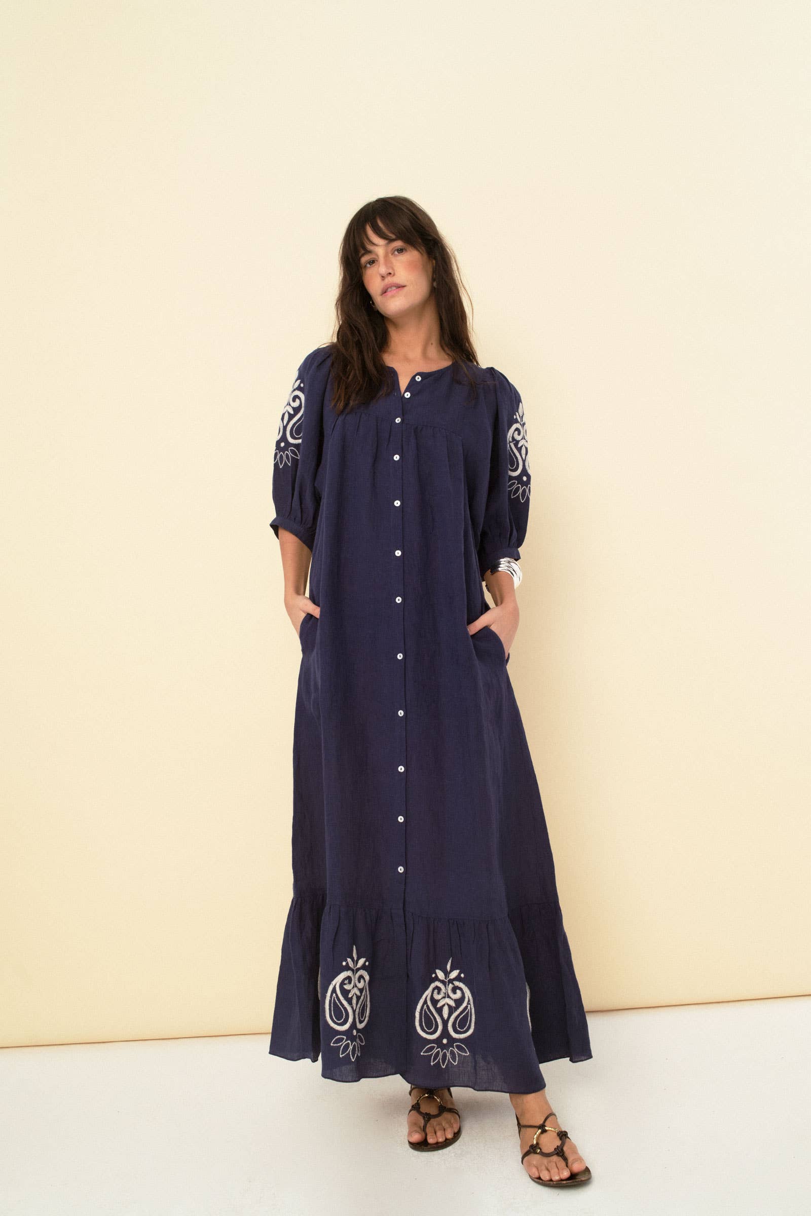 Our loved maxi dress Sofia features short sleeves covering elbow and front button closure. It is finished with a long ruffle with a detailed embroidery