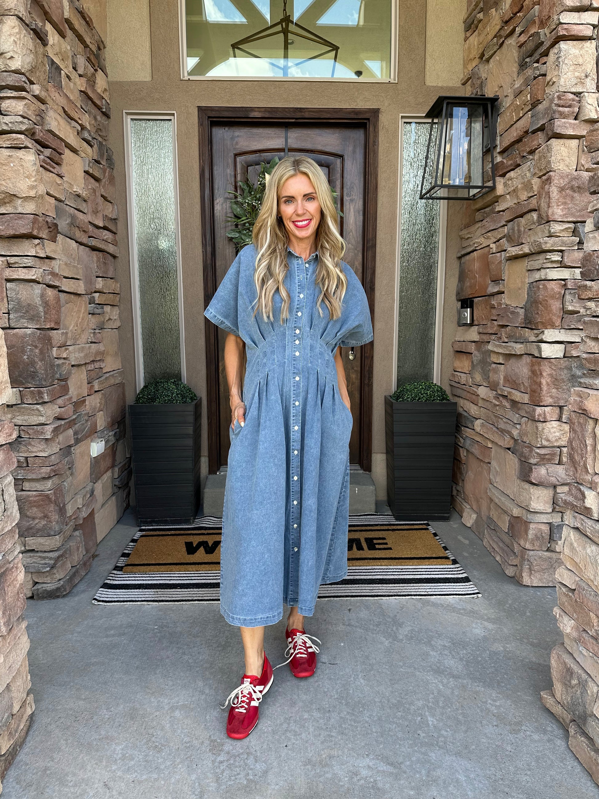 FThis midi dress has all the features you need - including a button-down front, stretchy denim fabric, a mineral-washed effect, and pleats at the waist. And let's not forget the added bonus of pockets! With its collared neckline and dolman sleeves, this dress is both stylish and practical.