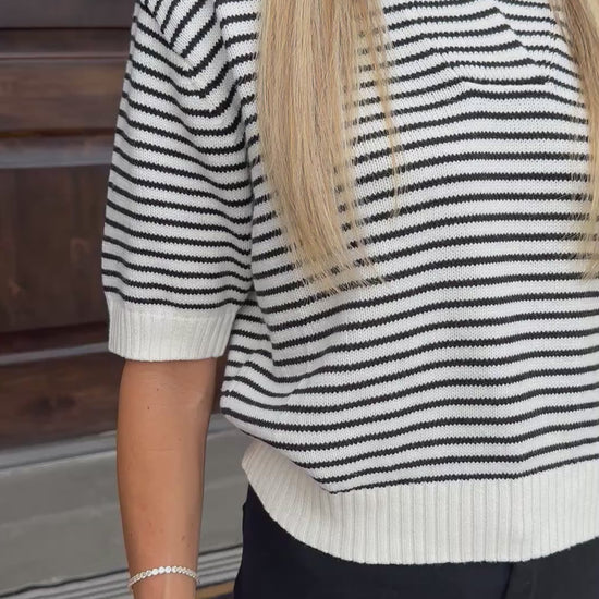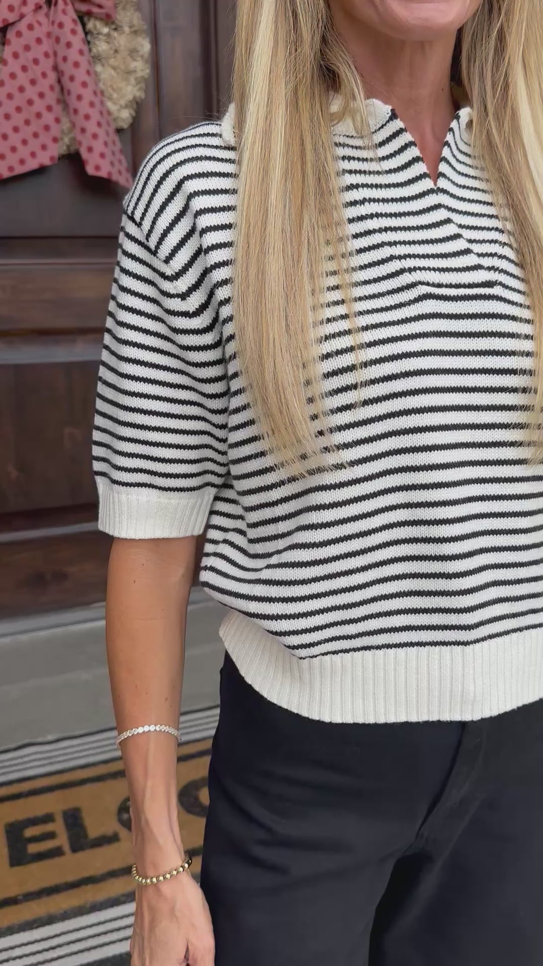 Nautical charm meets modern chic in the Mariner Striped Polo Knit. Crafted from a soft, breathable knit, this sweater features timeless black-and-cream stripes and a relaxed short-sleeve silhouette that’s perfect for year-round wear. The collared neckline with an open placket adds a polished touch, while ribbed trim at the hem and sleeves ensures a flattering fit.