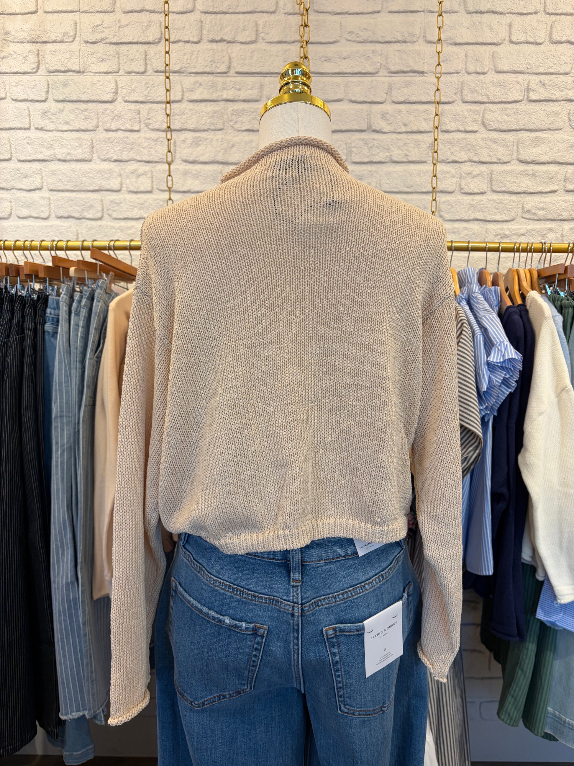 The Arden Knit Cardigan is the definition of understated chic. Crafted in a rich chestnut knit, this button-front sweater features delicate pearlized buttons, a relaxed boxy silhouette, and subtly rolled edges for a touch of effortless charm. Its cropped length pairs perfectly with high-rise denim or layered over dresses, making it a versatile piece you’ll reach for season after season. Timeless, cozy, and quietly elevated—an essential for your fall wardrobe.