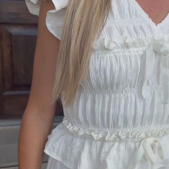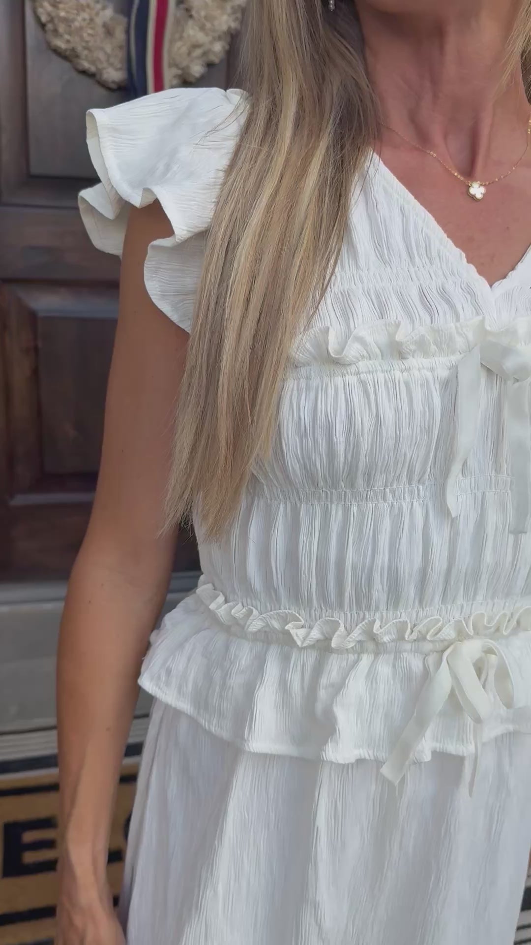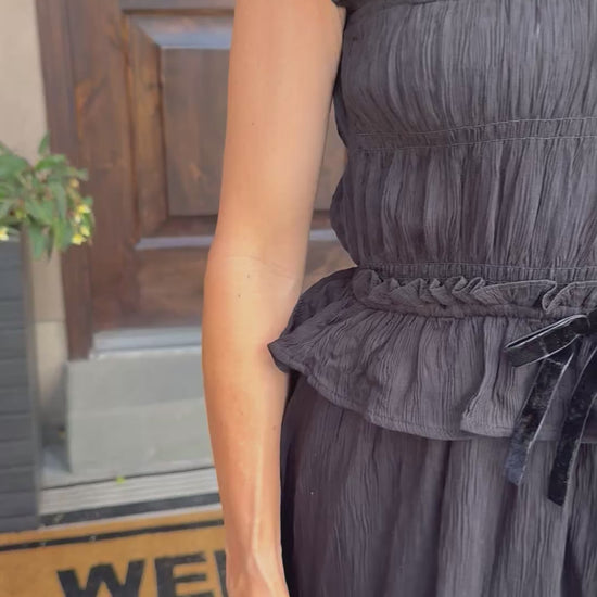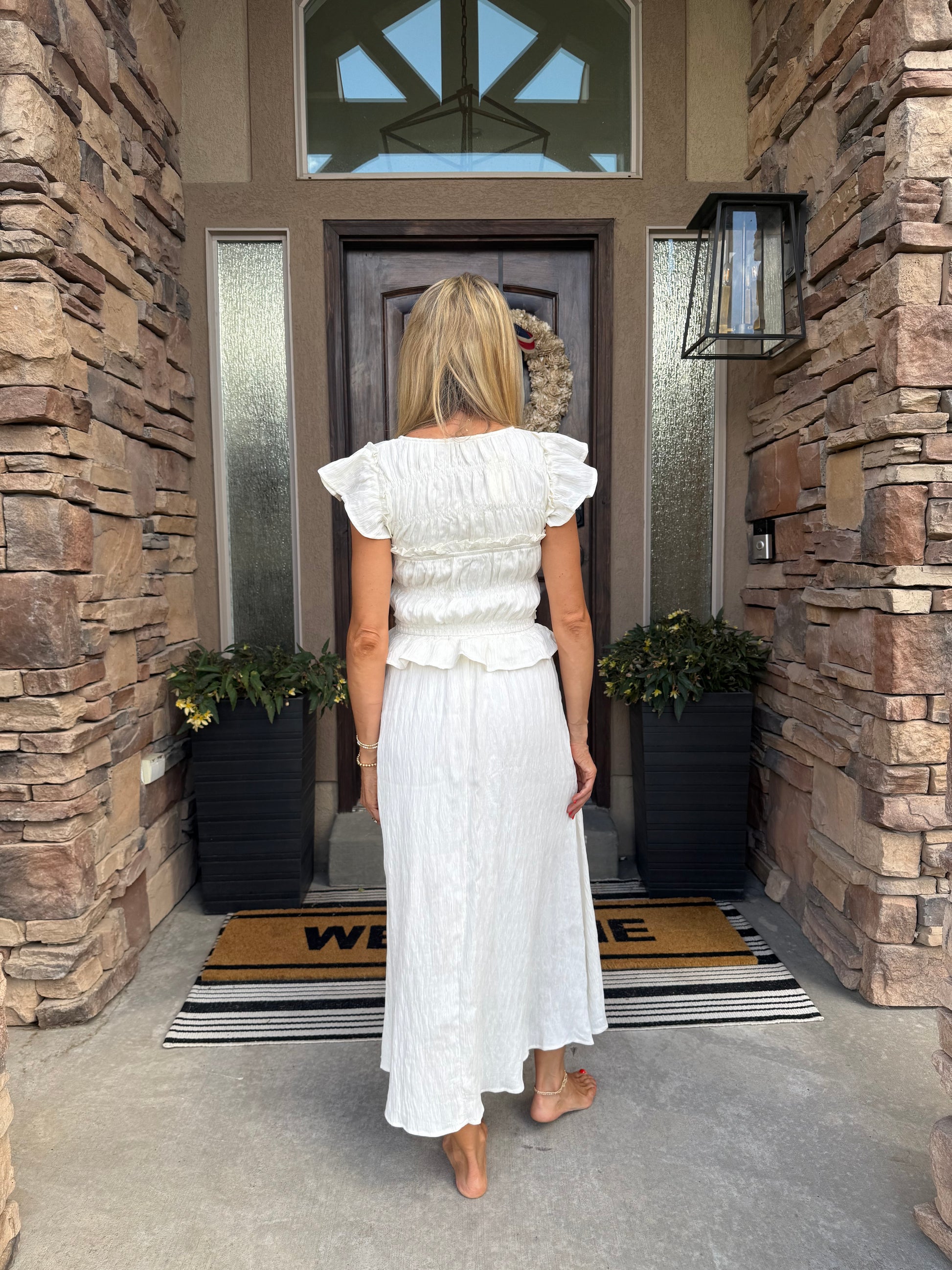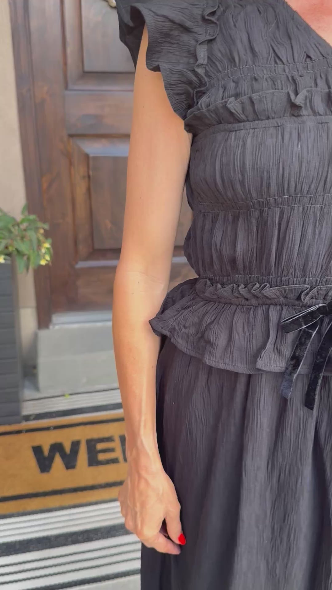 The Brinkley Dress is the epitome of effortless chic featuring a flutter sleeve, flattering cinched waist, and soft peplum detailing, this midi-length silhouette brings grace and movement to every step. The textured fabric adds depth while keeping things light and breathable—perfect for brunches, casual weddings, or sunset strolls. Available in classic black and soft ivory, Brinkley is a wear-anywhere favorite that transitions seamlessly from sandals to heels.
