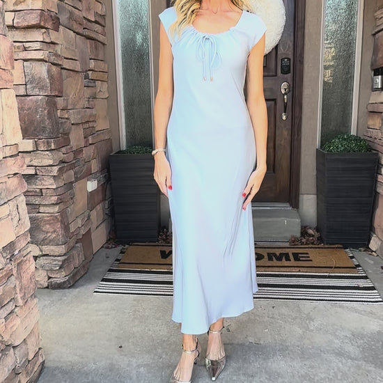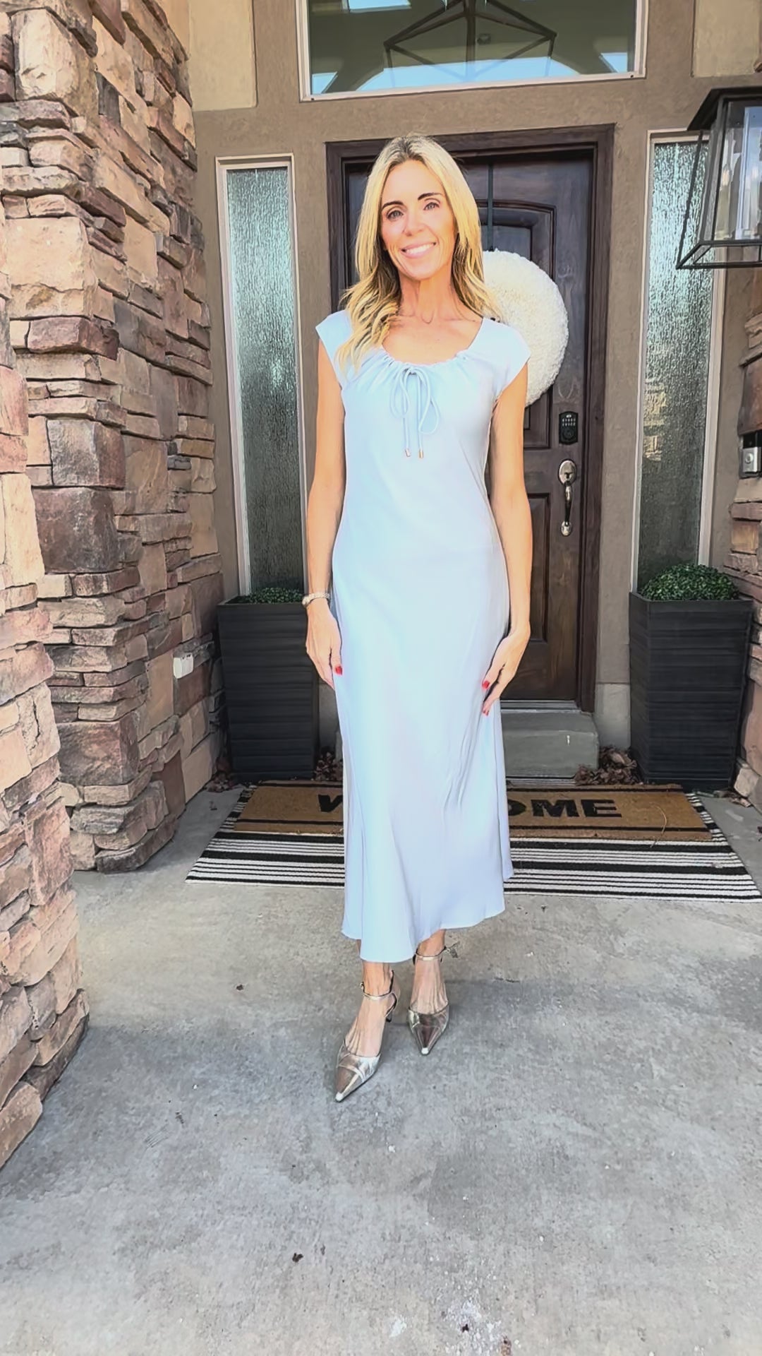Slip into understated luxury with The Celeste Satin Midi, a soft, sky-blue dream made for spring soirées, weddings, brunches, and everything in between. This dress features a fluid satin drape that skims the body without clinging, a delicate tie-front detail for a touch of romance, and a flattering cap-sleeve silhouette that feels effortlessly polished. The midi length keeps it classy yet modern, pairing perfectly with heels or strappy sandals.