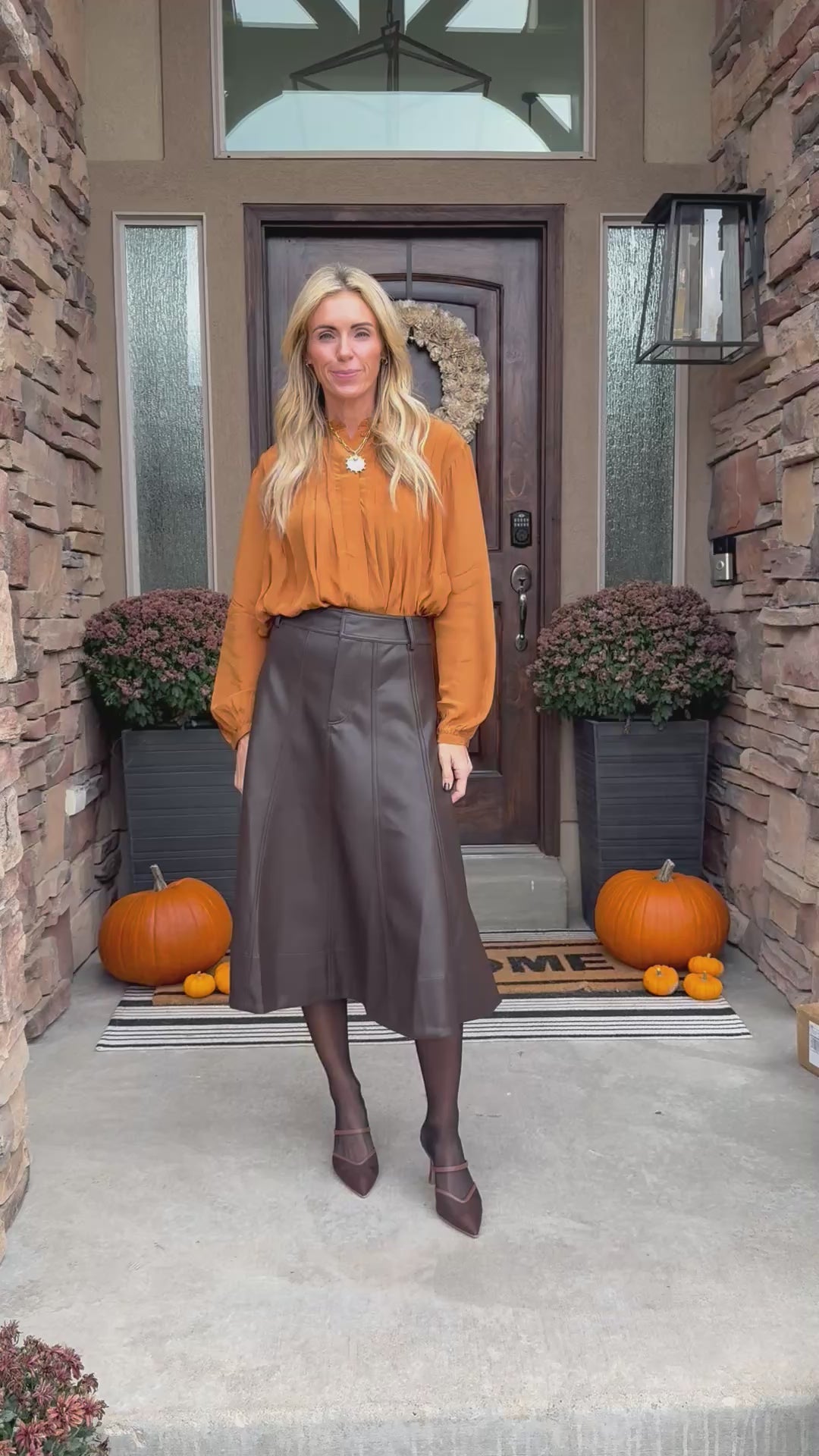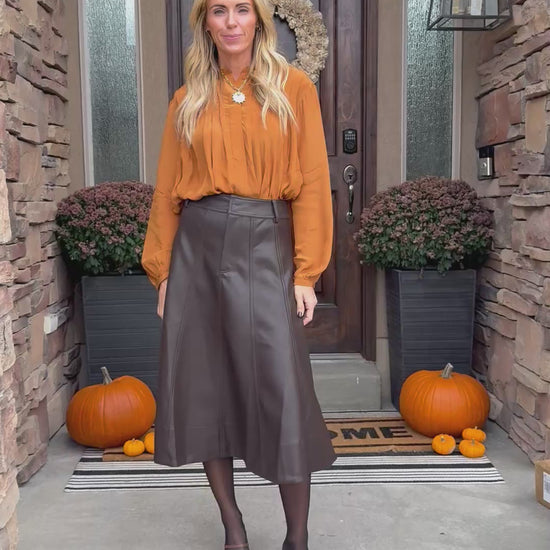 Rich, refined, and endlessly wearable — the Espresso Faux Leather Midi Skirt brings an elevated edge to your fall lineup. Crafted from smooth, supple vegan leather in a deep mocha-brown tone, this skirt combines timeless femininity with a modern silhouette. The high waist flatters your shape, while the A-line cut and midi length create effortless movement with every step.