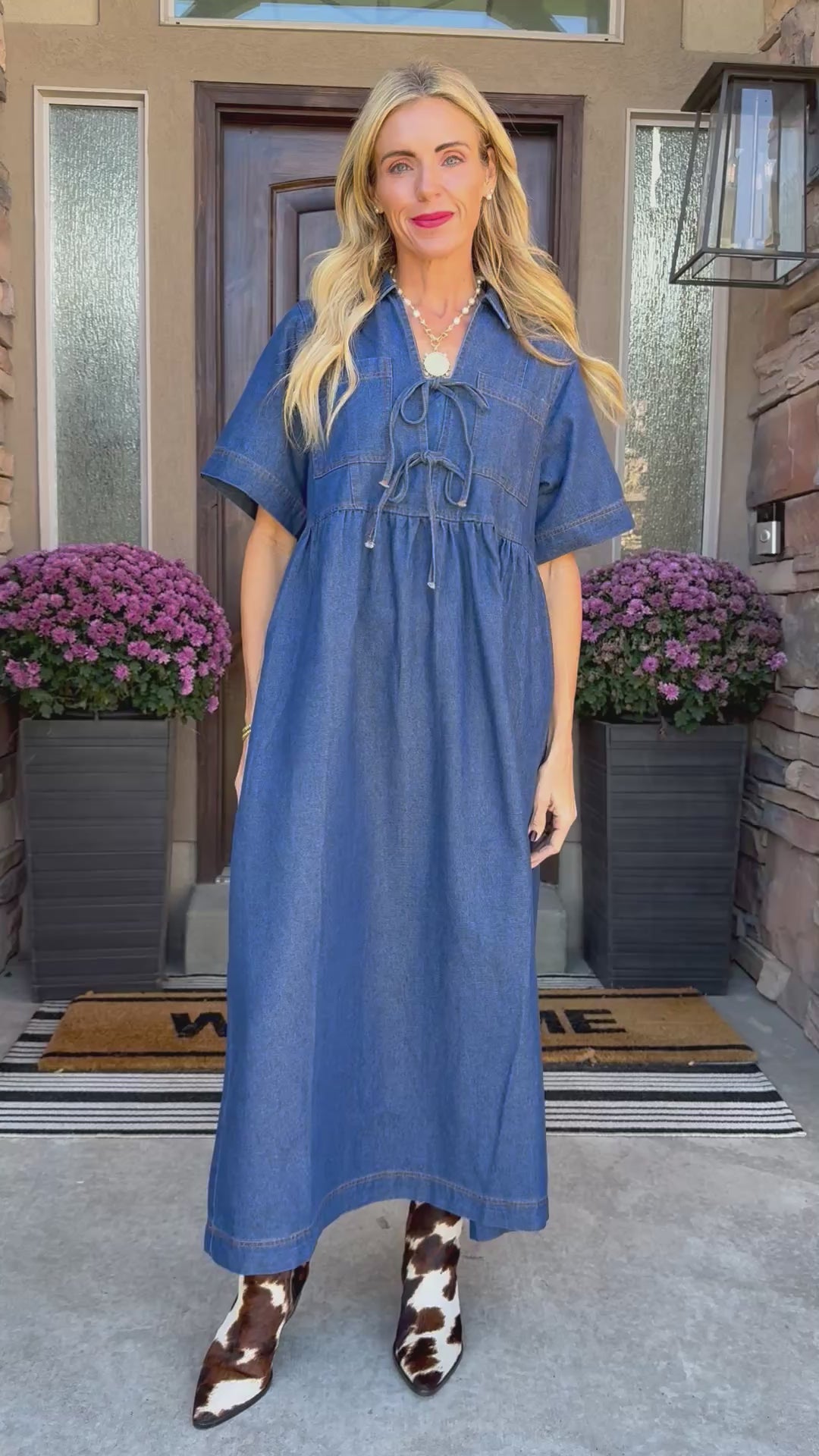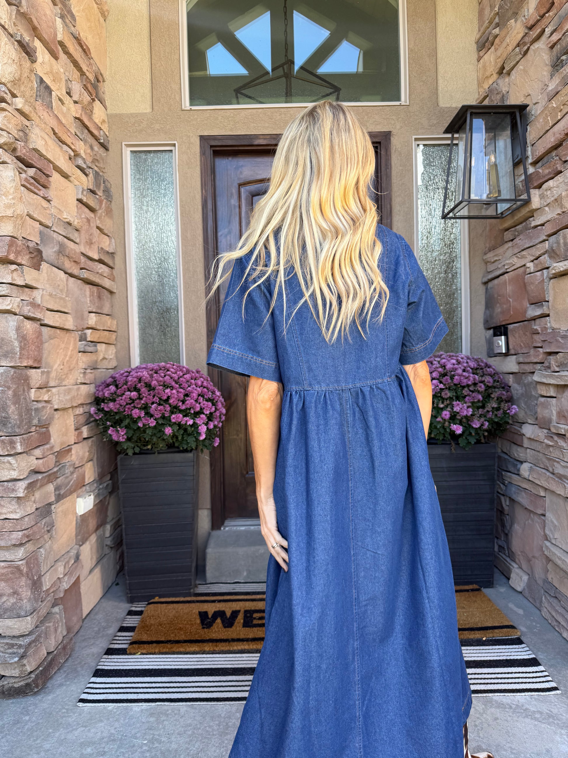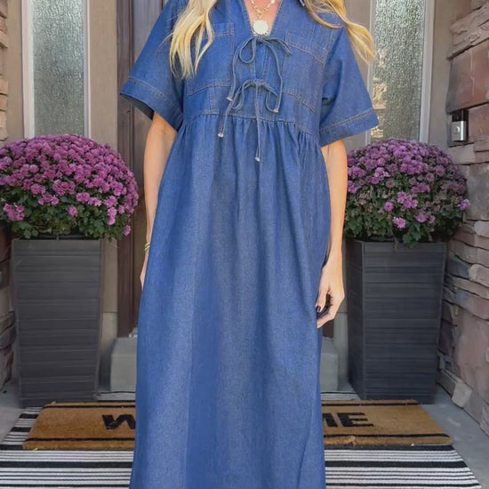 Meet The Tessa Denim Midi — a timeless blend of classic charm and modern ease. Crafted from soft, structured denim, this effortlessly chic dress features a flattering empire waist, tie-front detailing, and short sleeves with subtle stitching that adds texture and polish. The midi-length silhouette flows beautifully, perfect for pairing with ankle boots or sandals through every season.