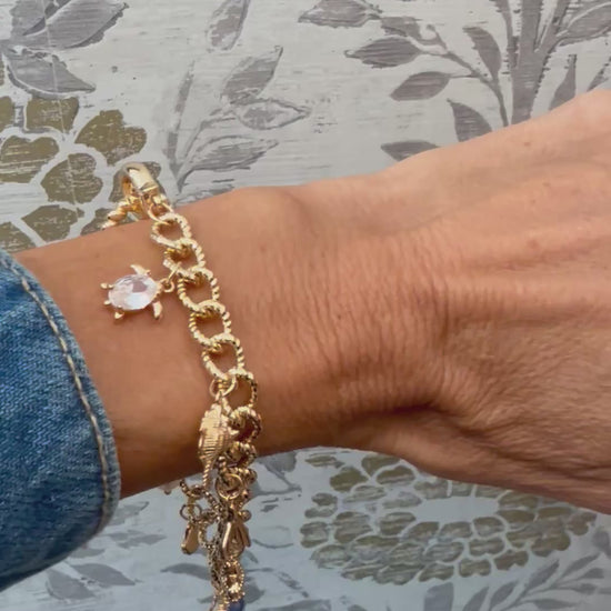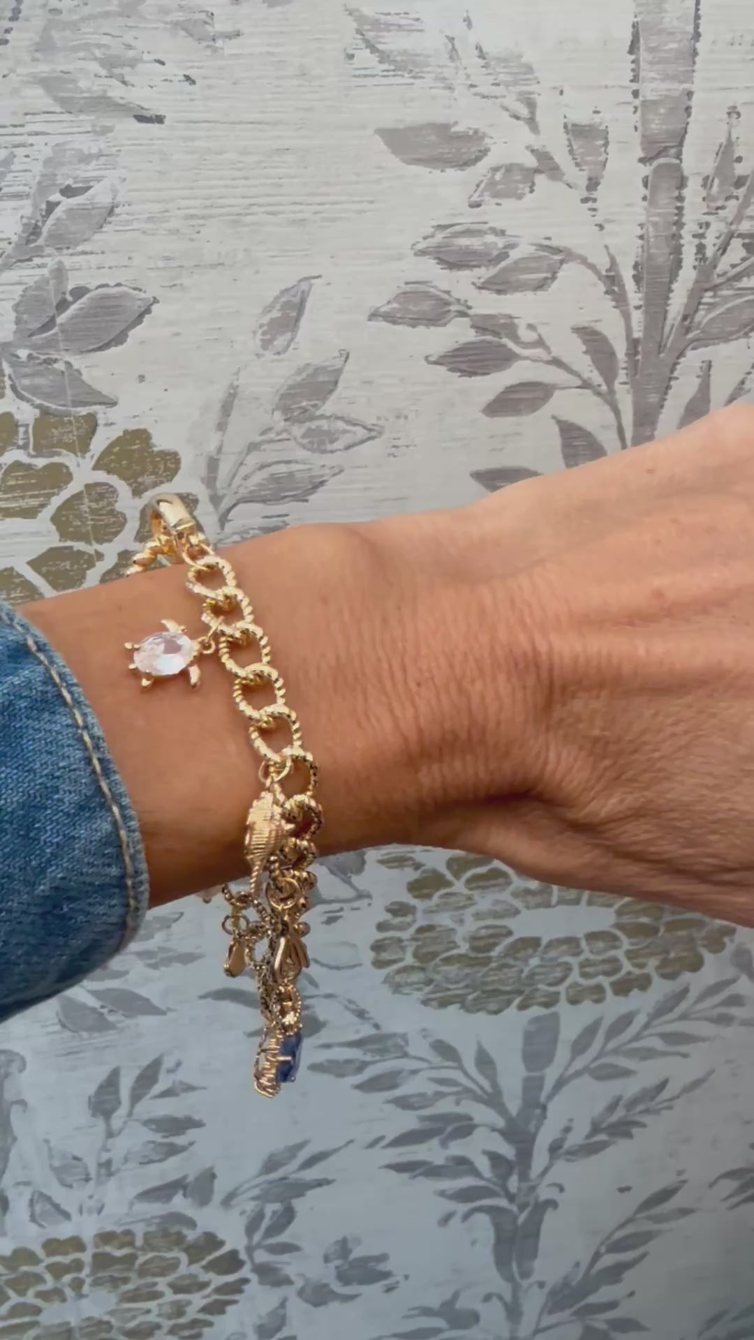 An effortless blend of coastal elegance and golden charm, the Azure Amour Bracelet is designed to feel like a little treasure collected over time. Featuring a luxe gold chain adorned with delicate seaside-inspired charms and a striking faceted blue heart centerpiece, this piece captures light—and attention—from every angle.